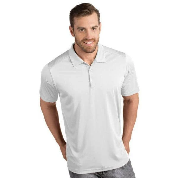 Gear up to make a statement with this sophisticated, high-performance staple. The fitted Tribute uses our quick-dry technology, 4-way stretch fabric, and UPF 55+ sun protection to keep you comfortable while braving the elements. This interlock knit polo has a self-fabric collar and narrow 3-button placket, and also sports open cuffs and side slits to maximize your comfort all day long. 100% polyester, with an Antigua patch on the right cuff.